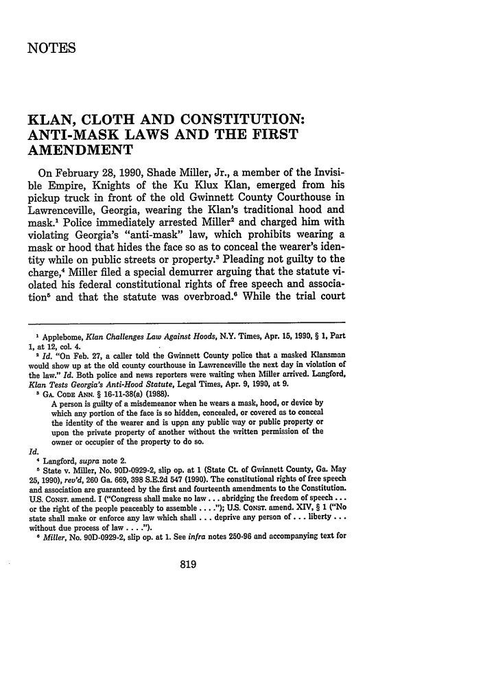 Klan Cloth And Constitution Anti Mask Laws And The First