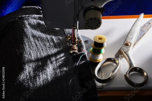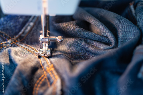 Repair Jeans On The Sewing Machine View Of The Fabric