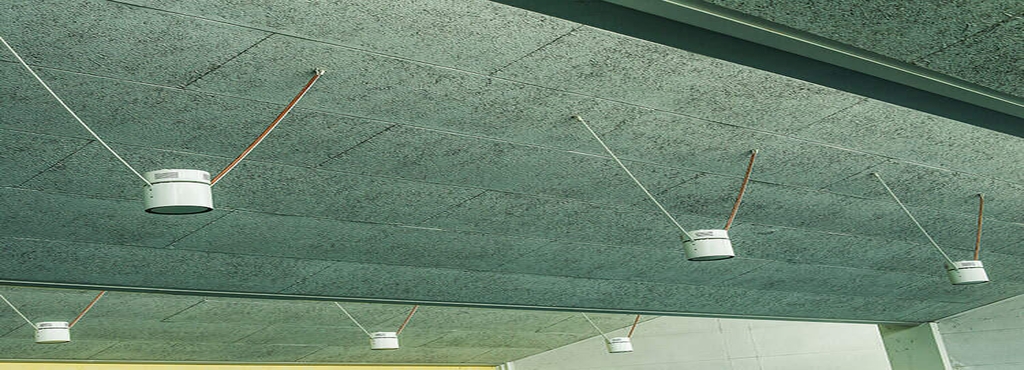 Fire retardant fabric is stapled to lightweight balsa wood strips installed as a frame along the walls. Fabric will reduce the industrial feel of bare ceiling joists. Rows of fabric are attached side by side to the ceiling joists so you can easily access the ceiling by removing the impeding fabric.